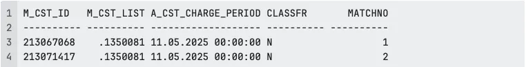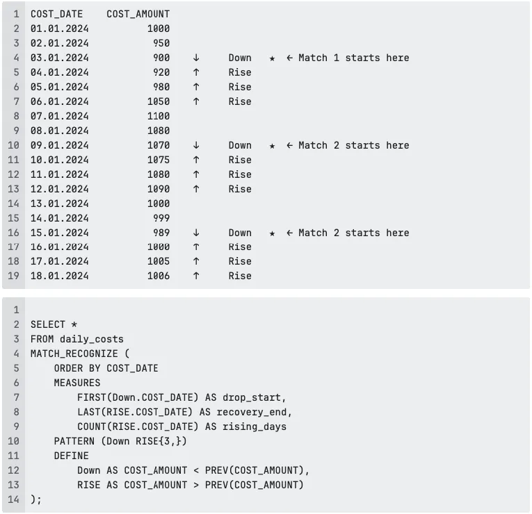 Notice how the “★” marks line up with the SQL pattern: each match starts at the single day of cost drop, and MATCH_RECOGNIZE then looks for at least three consecutive rising days. The query simply asks Oracle: “Show me the start of the drop, the end of the recovery, and how long the rise lasted.” In the query above, MATCH_RECOGNIZE scans the cost data in chronological order (ORDER BY COST_DATE). Each row is evaluated according to the pattern Down RISE{3,}: a single day of decreasing COST_AMOUNT(Down), followed by at least three consecutive days of increasing COST_AMOUNT(RISE).