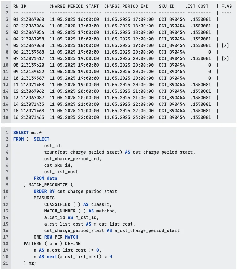 Think of MATCH_RECOGNIZE as a way of instructing the database: “Scan through my ordered rows, and whenever you detect gaps in date ranges, indicating that billing periods may have been accidentally skipped, capture and label them for me.”