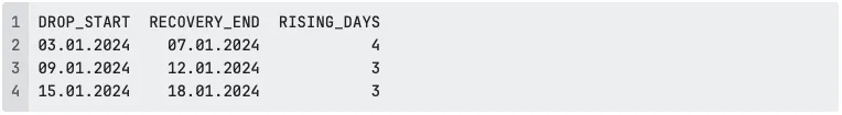 The MEASURES section picks the first day of the drop (FIRST(Down.COST_DATE)), the last day of the recovery (LAST(RISE.COST_DATE)), and counts how many consecutive rising days there were (COUNT(RISE.COST_DATE)).